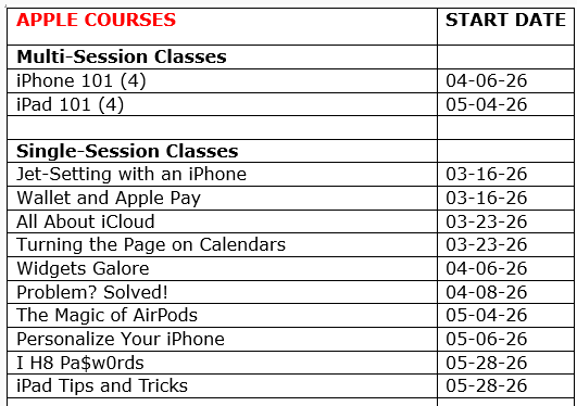 Classes for Users of Apple Products (Macs, iPhones, iPads, Apple Watch and more!) and Windows PCs